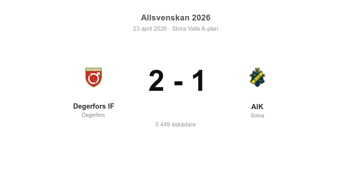 Degerfors IF vann med 2-1 mot AIK på Stora Valla i Allsvenskan den 23 april 2026.
